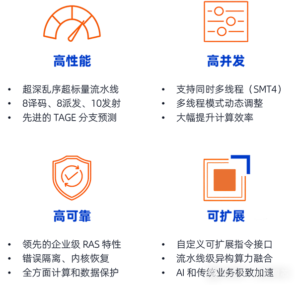 高并发:P100是国内唯一支持动态同时多线程(SMT)技术的CPU内核,最高支持4线程,并可根据业务特性在SMT1、SMT2、SMT3和SMT4模式间动态灵活切换。这一设计极大提升了CPU内核的线程级并发能力,显著提升计算资源的利用率和面效(性能/面积),完美契合泛在智能时代以数据为中心的计算范式。
