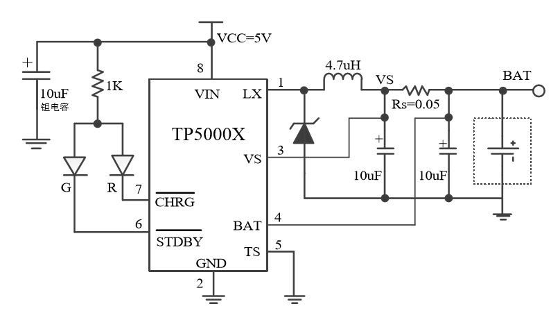 TP5000X具有宽输入电压,对电池充电分为涓流预充、恒流、恒压三个阶段,恒流充电电流都通过外部电阻调整,最大充电电流达2A。TP5000X采用频率800KHz的开关工作模式使它可以使用较小的外围器件,并在大电流充电中仍保持较小的发热量。TP5000X内置功率PMOSFET、防倒灌电路,所以无需防倒灌肖特基二极管等外围保护。