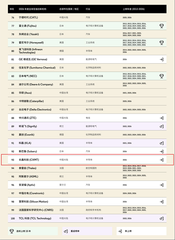据全球知识产权与科技信息分析权威机构科睿唯安(Clarivate)发布的2026年度“全球百强创新机构(Top 100 Global Innovators 2026)”榜单,中国存储芯片龙头企业长鑫科技凭借在DRAM领域的领先研发能力与扎实专利储备首次跻身“全球百强创新机构”榜单,也是此次上榜的7家中国大陆企业中,唯一一家半导体存储企业。