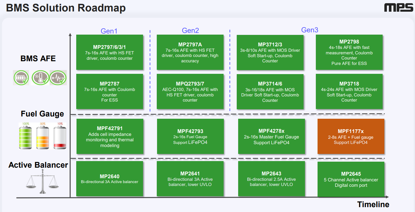 随着磷酸铁锂电池的大规模应用,SOC估算精度成为行业痛点,MPS的电量计产品线正从“锦上添花”变成“刚需”。