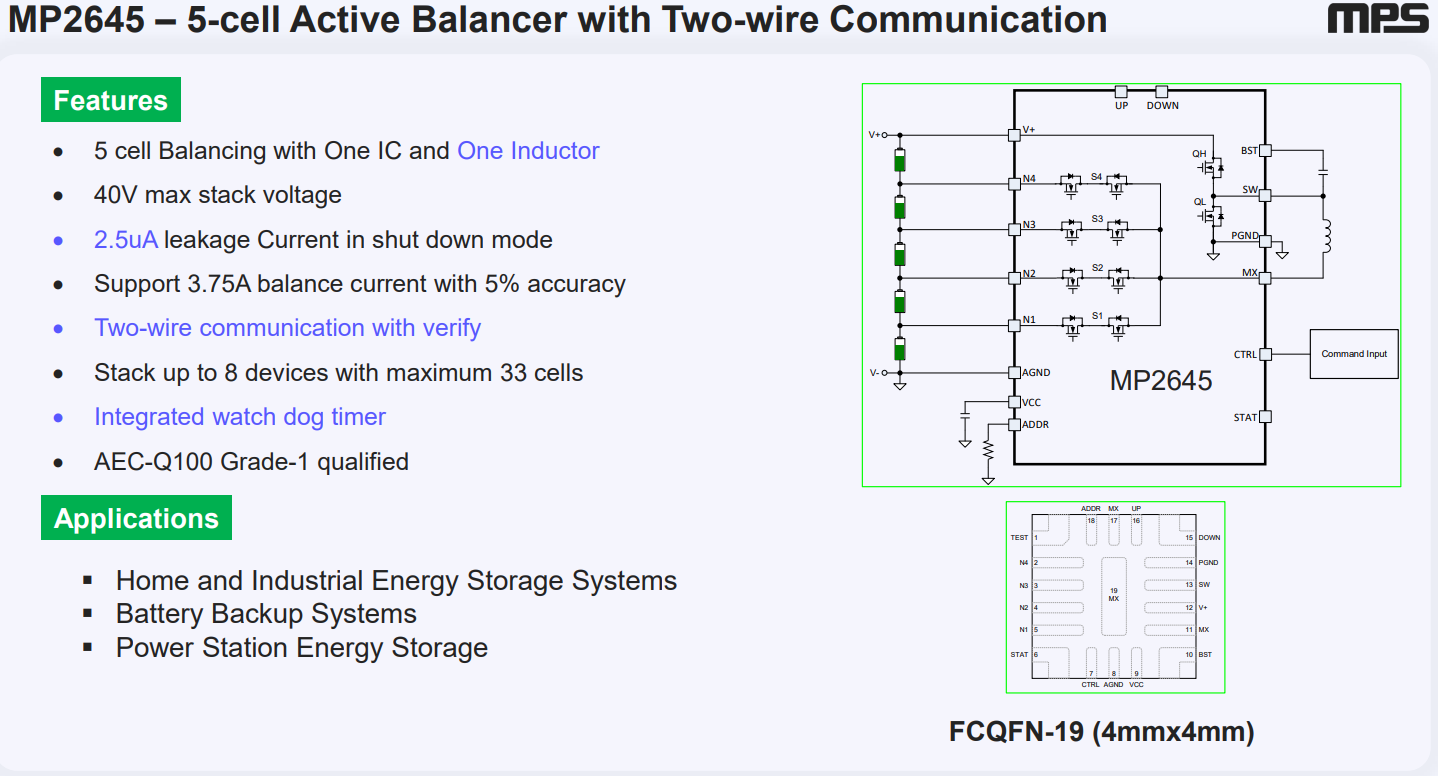 MPS选择了电感式相邻均衡路线,其最新产品MP2645是一颗全集成的五通道电池均衡器:1颗芯片加1个电感可执行5颗电芯的均衡,均衡电流达3.75A,控制精度5%,待机功耗仅2.5微安。可靠性方面,该拓扑中每个MOS管承受的最大电压应力不超过20V,MPS采用40V耐压工艺提供一倍安全余量。芯片内部集成数字通讯接口和看门狗,MCU失效后可自动回到安全状态。以16串电池包为例,4颗MP2645加4颗电感的方案整体体积与两枚硬币相当,可实现单面贴片。