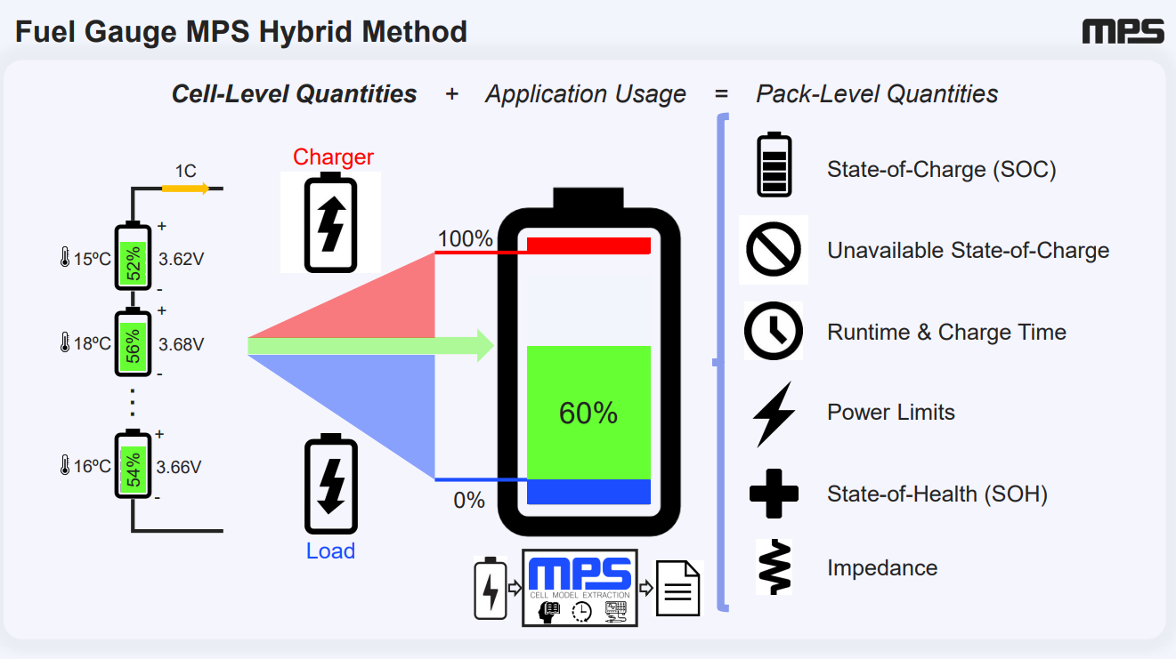 MPS的混合模型电量计融合了OCV、库仑积分、温度模型和阻抗模型,可报告单体电芯的SOC、SOH、充满时间、放空时间以及功率限制。目前主推的MP4278x系列被MPS称为“Master Fuel Gauge”——客户的MCU不再需要直接控制AFE,只需从电量计IC的寄存器中读取SOC、SOH、电压、电流、温度等数据,大幅缩短软件开发周期。
